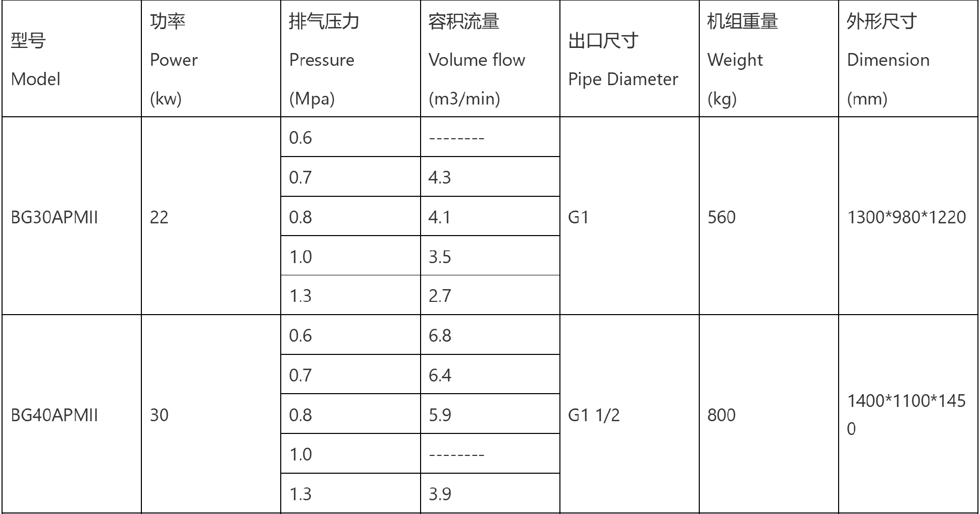 产品描述:采用高效,经久耐用的两级主机,可以实现多达15%的节能效果,转子经过二十道工序的精加工,保证转子线型的精准度,可靠性和有效性。双级压缩永磁变频螺杆空压机技术参数/Technical parameter型号Model功率Power(kw)排···